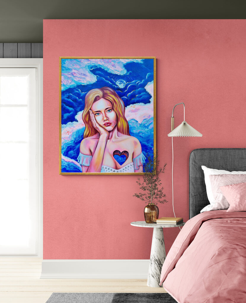 La particularité de cette toile réside dans le cœur évidé sur la poitrine de la jeune femme, laissant entrevoir le même ciel tumultueux, créant une connexion intime entre ses émotions intérieures et l’univers qui l’entoure. Son expression, empreinte de douceur et de résignation, invite le spectateur à contempler la vulnérabilité et la profondeur de ses sentiments.